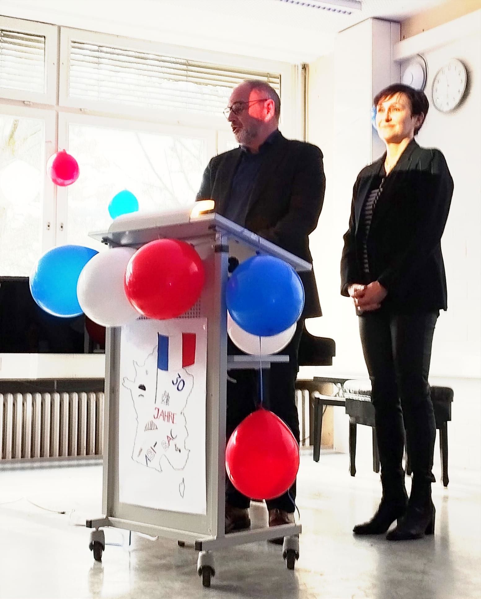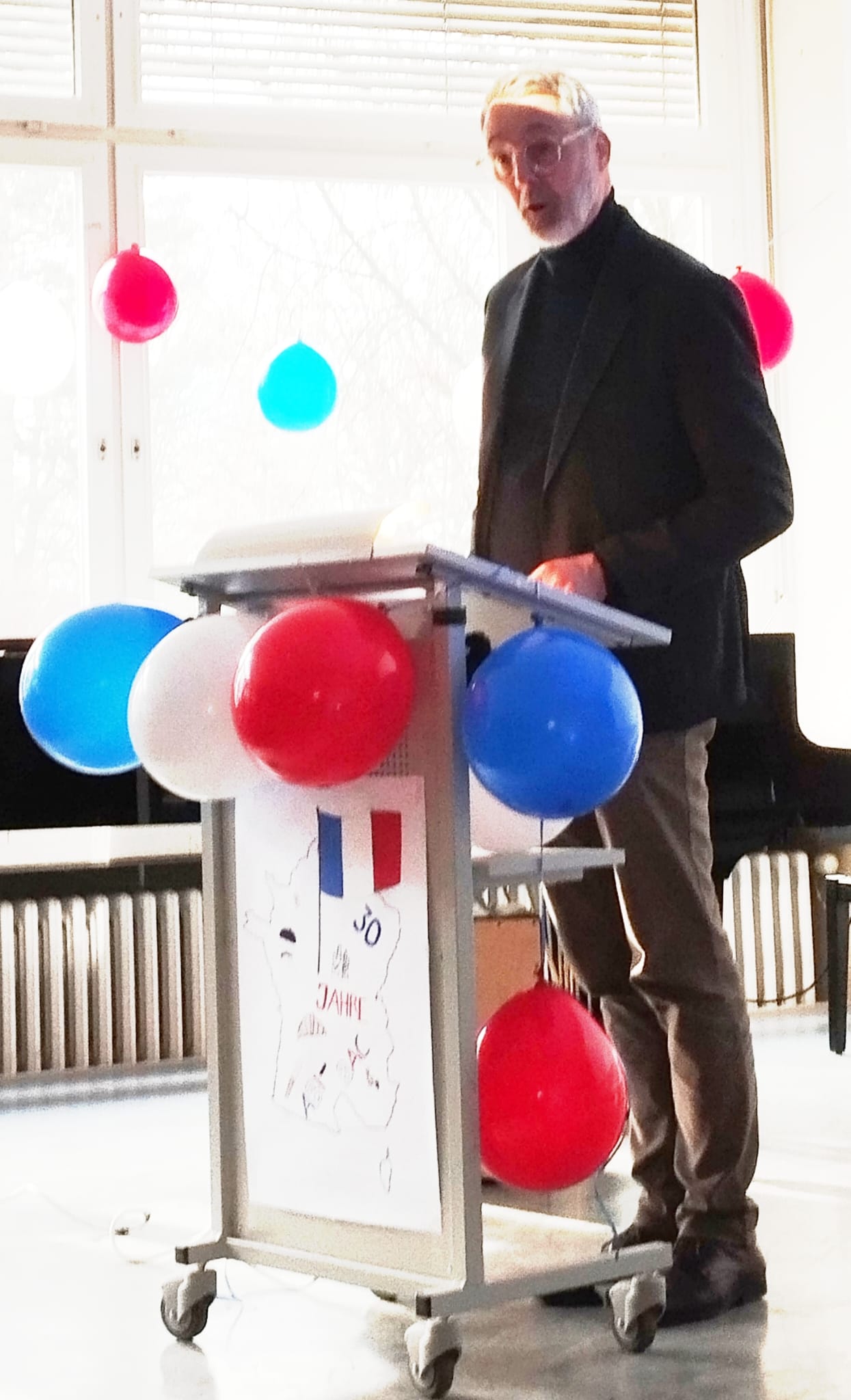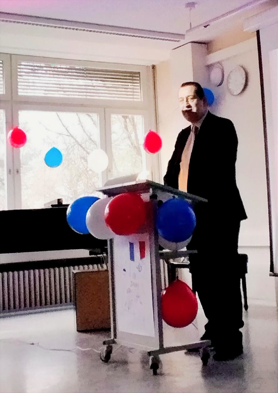 Le directeur du lycée Bunsen, M. Nürk, a accueilli les acteurs de ce partenariat et le public au sein de son établissement ; c’est également lui qui a ouvert la cérémonie par un discours mettant en lumière les liens forts et historiques unissant nos deux écoles.